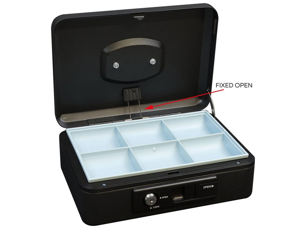 Tento model je navržen pro rychlou a efektivní práci. Unikátní vnější páčka zajišťuje okamžité automatické otevření víka. Díky funkci automatické aretace zůstane víko po zavření pevně zajištěno, což umožňuje bezpečné přenášení pokladničky i bez nutnosti okamžitého uzamčení klíčem.