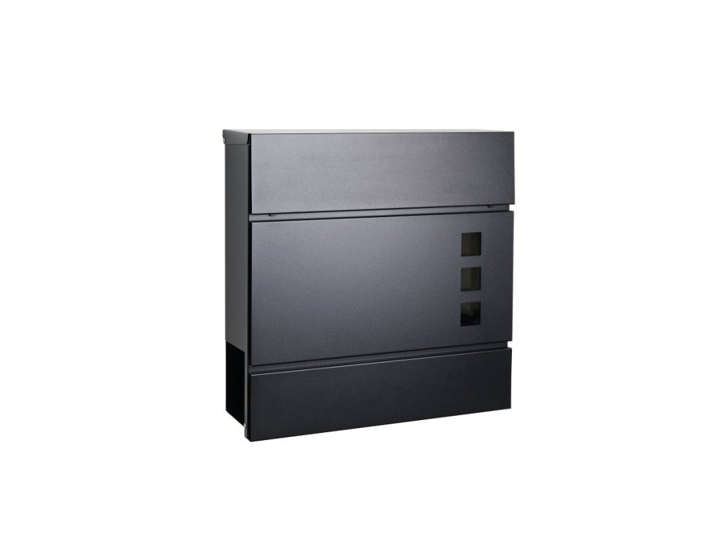 BK.932.G.CM je designová ocelová poštovní schránka s moderními okénky z čirého plexiskla, která umožňují částečný průhled do vnitřního prostoru. Součástí schránky je také praktický tubus na tiskopisy, díky kterému zůstávají dokumenty chráněné a přehledně uložené. Ideální řešení pro rodinné domy i reprezentativní vstupy.