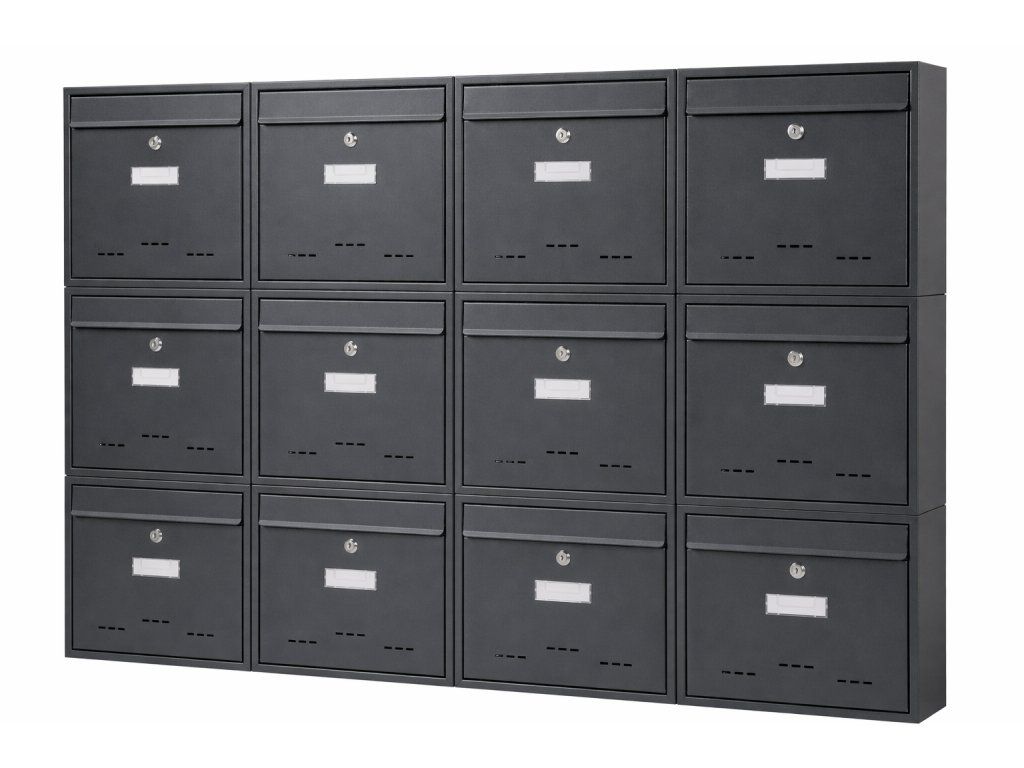 Sestava 12 poštovních schránek představuje ideální řešení pro bytové domy, SVJ nebo větší obytné objekty. Díky uspořádání 4×3 získáte přehledný, jednotný a profesionální systém doručování pošty bez nutnosti kombinovat jednotlivé schránky.
